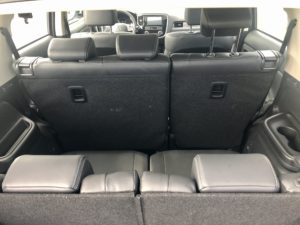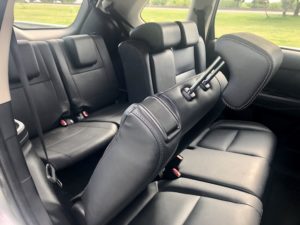 La tercera fila tienen toma de 12V para cargar y dos posavasos. También hay dos cinturones inerciales. El portón trasero es eléctrico, se abre y cierra solo.